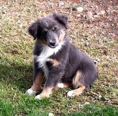 Black tri with the dilute gene, giving her coat the color of steel. This is not a recognized Aussie color, but it sure is gorgeous. Lots of copper trim on this girl too.